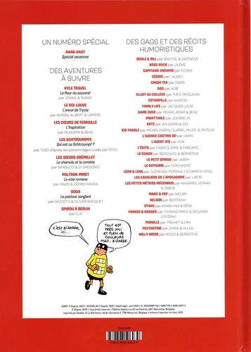 4440 1 1 Cédric Couverture Laudec K 2 1 Elliot au collège Gag Théo Grosjean coul Anna Maria Riccobono K 3 0,2 Sommaire K 3 0,8 L'édito Gag Fabrice Erre coul Sandrine Greff Fabcaro Justine Cunha K 4 1 Cédric Autre Un jour dans la vie de Laudec Laudec DP K 5 4 Cédric Histoire complète Laudec coul Léonardo 500 K 9 1 Nelson Gag Bertschy 5078 5079 5080 5081 K 10 6 Les schtroumpfs A suivre Qui est ce schtroumpf ? Tebo K 13 0 Spoireau et Fantasperge Gag Hauts de page K 16 1 willy wob Gag Bernstein & Moog K 17 0,25 L'abonné de la semaine Autre Marushka Szarzynski K 17 0,25 Le strip dont vous êtes le héros Gag Lison Truchet Libon Sergio Salma K 17 0,5 Autre Les BD de ma vie Lucy Mazel Flix PS Photo de Flix K 18 9 les soeurs grémillet A suivre Le chamois et la comête Barbucci Di Gregorio K 27 1 Publicité Dupuis Sofia Fraisier K 28 2 Mélusine Gag Mélusine à la rescousse Armelle Drouin K 30 0,25 Des gens et inversement Gag Perth K 30 0,25 l'antre case Gag Derache + Waltch 014 K 30 0,25 Les fifiches du pro professeur Gag Lécroart K 30 0,25 Tash & Trash Gag Dino 718 K 31 5 Les cœurs de ferraille A suivre L'inspiration Munuera coul Sedyas Beka K 36 1 Léon & Léna Gag Clémence coul mista Blatte Damien Cerq K 37 1 Psychotine Gag zimra Romain Pujol K 38 1 Pernille Gag Cyril Trichet coul Esteban Dav K 39 1 Spirou et moi Autre Nicolas Gaignard Nicolas Gaignard ?? Photo de Nicolas Gaignard K 40 7 Soda A suivre Le pasteur sanglant Bruno Gazzotti coul usagi Olivier Bocquet 40 K 47 1 Publicité Parc Spirou K 48 2 Jeux C'est la récré ! Coul Maëlys D'après Laudec et Cauvin K 50 0,2 En direct du futur Autre L'expo continue ! Thierry Tinlot K 50 0,3 la semaine prochaine Autre Bercovici ?? K 50 0,5 Tarif abonnements Cromheecke Thiriet K 51 1 Game over Gag Midam & Adam coul Angèle Midam & Benz G822 K 52 1 Dad Gag ,ob 415 K 4441 1 1 Game over Couverture Midam K 2 1 Elliot au collège Gag Théo Grosjean coul Anna Maria Riccobono K 3 0,2 Sommaire K 3 0,8 L'édito Gag Fabrice Erre coul Sandrine Greff Fabcaro Justine Cunha K 4 2 Game over Gag Midam & Adam coul Angèle Midam & Benz G808 K 6 8 Les schtroumpfs A suivre Qui est ce schtroumpf ? Tebo K 13 0 Spoireau et Fantasperge Gag Hauts de page K 14 1 Otaku Gag Maria Paz Nena K 15 0,25 L'abonné de la semaine Autre Louise Roux K 15 0,25 Le strip dont vous êtes le héros Gag Chloé Wirth Libon Sergio Salma K 15 0,5 Autre Les BD de ma vie Arthur de pins Arthur de pins PS Caricature de Arthur de pins K 16 9 Les cœurs de ferraille A suivre L'inspiration Munuera coul Sedyas Beka K 25 1 Publicité Melvina K 26 1 Léon & Léna Gag Clémence coul mista Blatte Damien Cerq K 27 2 Game over Gag Midam & Adam coul Angèle Midam & Benz G829 K 29 1 Psychotine Gag zimra Romain Pujol K 30 0,25 Des gens et inversement Gag Perth K 30 0,25 l'antre case Gag Derache + Waltch 015 K 30 0,25 Les fifiches du pro professeur Gag Lécroart K 30 0,25 Tash & Trash Gag Dino 719 K 31 6 les soeurs grémillet A suivre Le chamois et la comête Barbucci Di Gregorio K 37 1 Pernille Gag Cyril Trichet coul Esteban Dav K 38 1 la leçon de BD Autre Planche de Louise Zampa Marko K 39 7 Soda A suivre Le pasteur sanglant Bruno Gazzotti coul usagi Olivier Bocquet 47 K 46 1 Capitaine Anatole Gag Floris 224 K 47 1 Le métier le plus dangereux du monde Publicité Dupuis copyright JMF K 48 2 Jeux Game Over Tyst K 50 0,2 En direct du futur Autre Grand final à New York Betbeder K 50 0,3 la semaine prochaine Autre Bercovici ?? K 50 0,5 Tarif abonnements Cromheecke Thiriet K 51 1 Game over Gag Midam & Adam coul Angèle Midam & Benz G823 K 52 1 Dad Gag ,ob 416 K